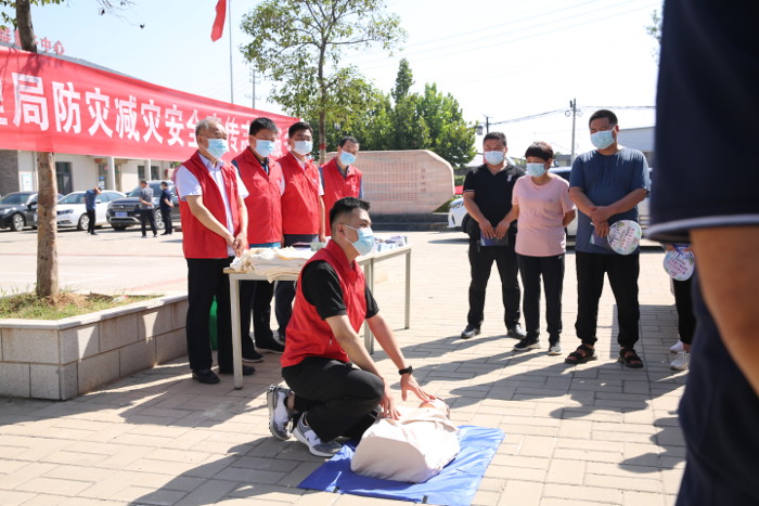 在村党员群众活动中心广场,志愿者向村民开展了一场生动的防灾减灾救灾安全知识宣讲,宣讲了习近平总书记关于安全生产、防灾减灾等重要论述和自然灾害、安全生产事故的分类预防,同时对村民开展心肺复苏操作培训,发放居民知识手册、安全生产法及围裙、扇子等宣传品300余份,调动了村民学习自救互救技能的积极性。