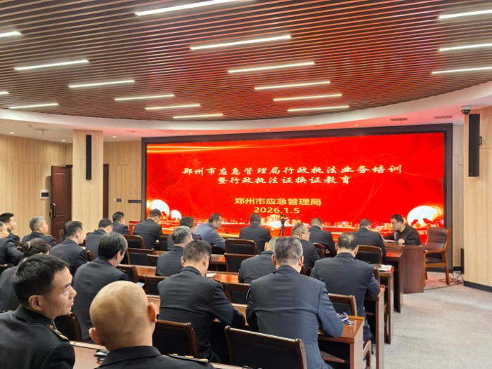 为深化应急管理综合行政执法体制改革,郑州市应急管理局以统一换发新版行政执法证件为契机,先行筑牢法治执法根基,并于近日举行行政执法业务培训暨新版行政执法证件换发仪式,以 “对党忠诚、纪律严明、赴汤蹈火、竭诚为民” 训词精神为引领,打造一支政治坚定、业务精通、作风过硬的执法队伍,为绿城安全发展注入法治动力。