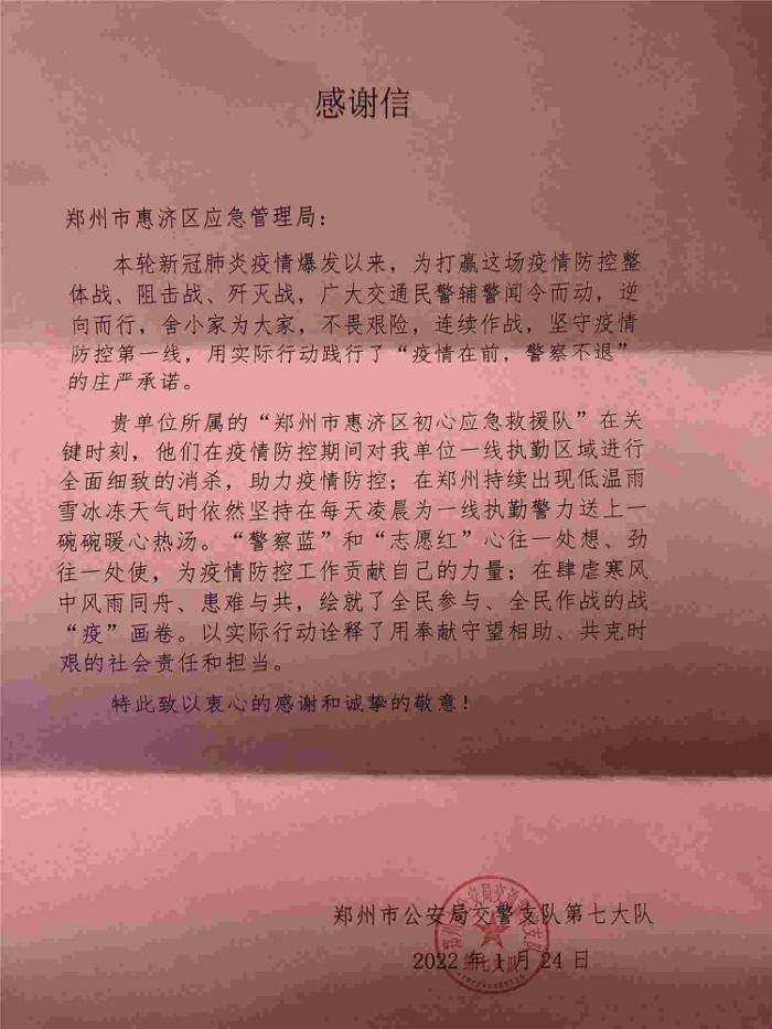 感谢信中表示:贵单位所属的“郑州市惠济区初心应急救援队”在关键时刻,在疫情防控期间对我单位一线执勤区域进行全面细致的消杀,助力疫情防控;在郑州持续出现低温雨雪冰冻天气时依然坚持在每天凌晨为一线执勤警力送上一碗碗暖心热汤。“警察蓝”和“志愿红”心往一处想、劲往一处使,为疫情防控工作贡献自己的力量;在肆虐寒风中风雨同舟、患难与共,绘就了全民参与、全民作战的战“疫”画卷。以实际行动诠释了用奉献守望相助、共克时艰的社会责任和担当。特此致以衷心的感谢和诚挚的敬意!