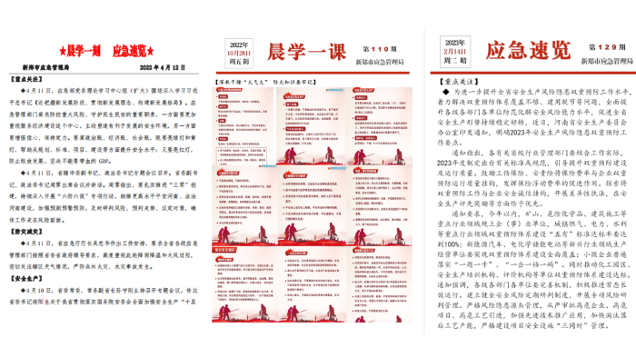 四、加大宣传广度力度,强化安全“防护罩”。多渠道扩大应急管理和安全生产宣传教育覆盖面。与融媒体中心联合,积极拓展应急管理知识普及宣传渠道,通过新郑电视台、官微“新郑发布”、“新郑融媒”、“云上新郑”APP等系列新媒体平台,采用飞播、漫画、动画、3D影像等群众喜闻乐见的宣传方式,多维度、高频次面向全市广大群众推送消防安全、燃气安全、用电安全、电梯安全、公共设施安全、高层建筑安全、人员聚集场所、防灾减灾救灾、应急救援等各领域相关应急科普知识,推动安全宣传“进企业、进农村、进社区、进学校、进家庭”活动深入开展。同时在全市应急管理系统创新开展《晨学一刻 应急速览》学习专题简报,每天收集汇总省、郑州市应急管理工作最新会议精神、政策解读,应急管理领域工作动态,以及应急专业知识编发全系统,至今已发布130期,以“日日不断之功”提高基层应急人员知识储备。