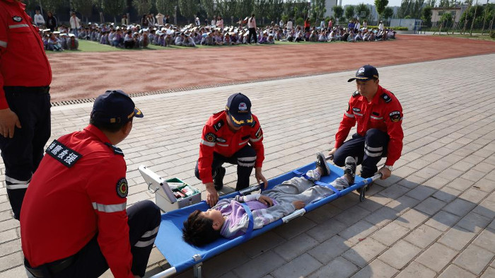 4点30分,演练正式开始,随着警报拉响,各点位人员立即到位,在班教师立即停课,组织学生有序离开班级,到学校空旷地带进行紧急避险。本次演练参加学生1694人,教师74人,部署安全点位28个,全体师生用时1分50秒安全完成应急疏散任务。演练过程中,郑州神鹰救援队还对“伤者”进行了伤口包扎以及心肺复苏等应急救护演示,和学生现场互动,为师生带来了一场生动的防震救灾现场课。