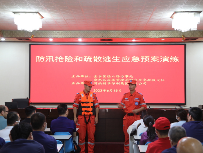 6月15日下午,金水区综合应急救援大队联合经八路办事处在河南新华印刷集团开展防汛抢险和疏散逃生应急预案演练,集团共约100人参加培训。