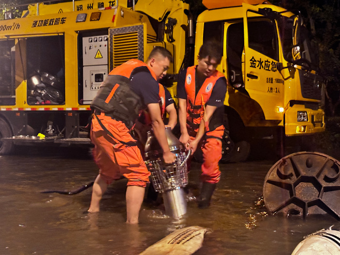 接到群众电话后,区综合应急救援大队按照预案部署,快速行动,有序组织人员进行抢险救援,第一时间赶赴各积水点展开抢险排涝和道路清淤,出动4200m³/h排涝抢险车、工程抢险车、应急照明车、运兵车等大型机械设备和车辆到积水地段进行抢险作业。