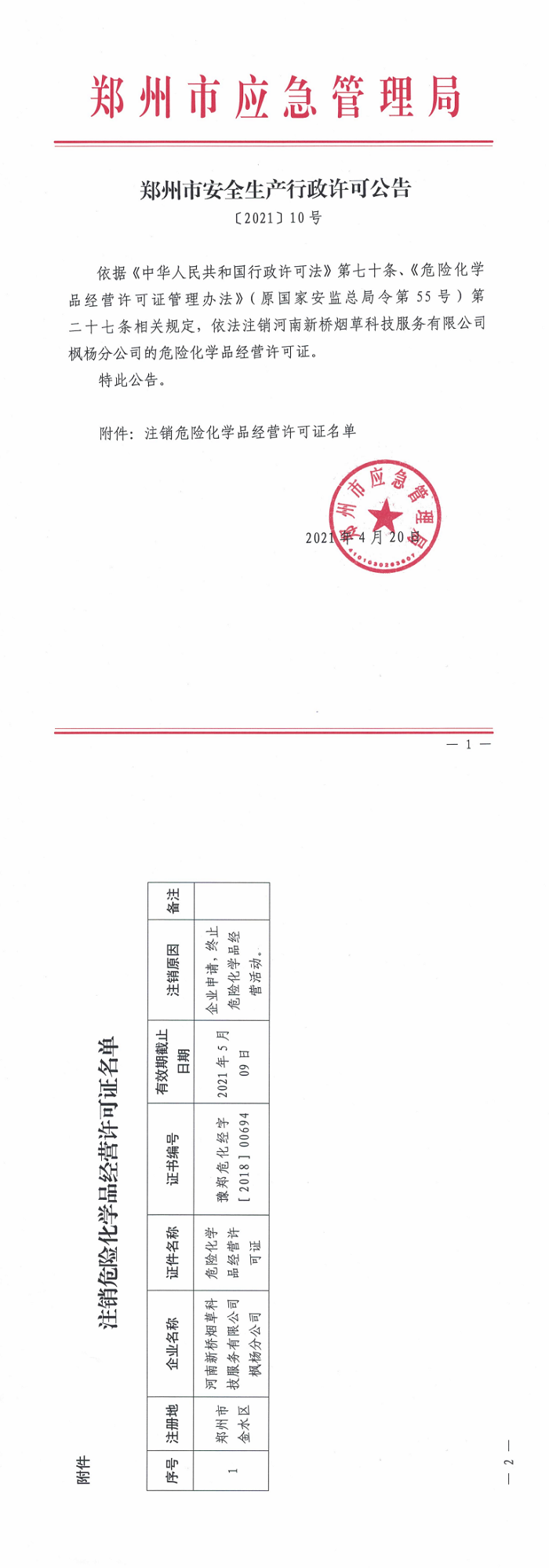 郑州市安全生产行政许可公告〔2021〕10号